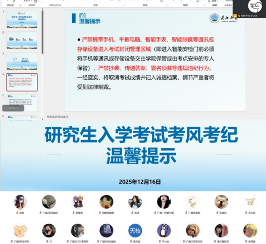 在考前准备提醒环节,班会结合研考实际要求,为同学们提供了全面的备考指引。包括证件、文具准备,考点熟悉,考试流程,此外,班会特别强调,严禁携带手机、平板电脑、智能手表、智能眼镜等通讯或存储设备进入考试封闭管理区域,进入智能安检门前需将相关设备交由学院或考点专人保管,严禁抄袭、传递答案、冒名顶替等违规违纪行为。