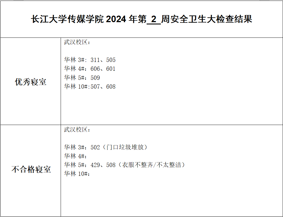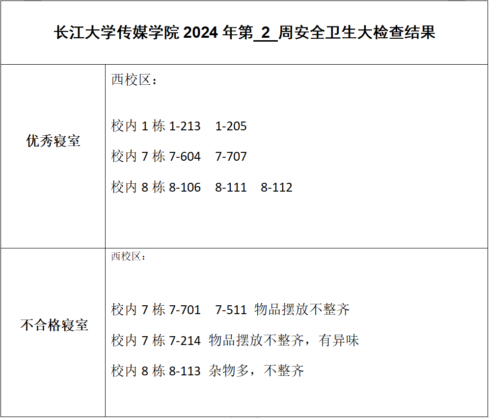K1体育员工会对寝室卫生与安全方面进行检查,要求同学们加强寝室清洁管理,保持宿舍环境干净卫生,一起打造清洁安全、文明和谐的宿舍环境。同时,员工会对员工宿舍检查结果进行汇总,结果如下: