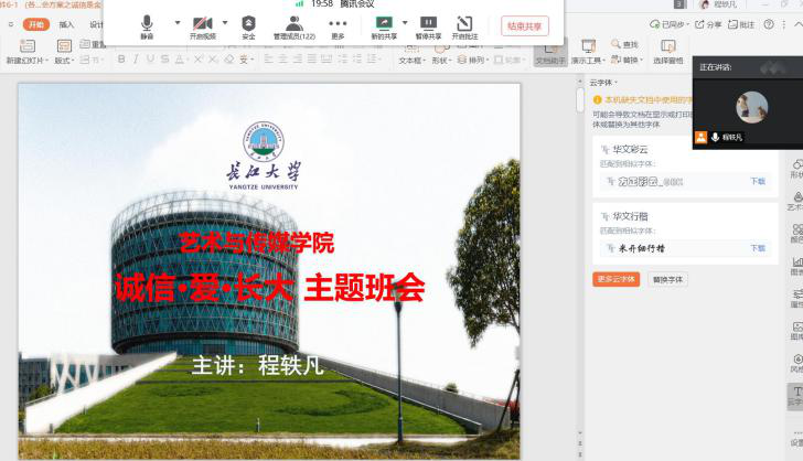 活动伊始,辅导员们以PPT图片的形式开展了诚信抗疫教育。带领同学们学习2017年新颁布的《普通高等学校员工管理规定》(中华人民共和国教育部令第41号)之第五章奖励与处分、《湖北省人民政府办公厅关于加强个人诚信体系建设的实施意见》及安全教育。同时鼓励同学们在疫情这种特殊环境下要有一颗平常心,注重心理健康,始终要有新青年朝气蓬勃、勇于奉献、敢于担当的精神,以及对美好生活的向往和追求,提倡大家培养诚信品质,努力营造家校诚信氛围。
