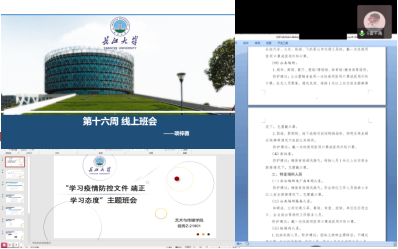 (通讯员:程轶凡)当前我国疫情防控向好态势进一步巩固,复工复产取得重要进展。2020年5月31日,艺术与K1体育全体辅导员围绕疫情防控及信息报送、网络远程教学、期末复习备考等重点工作,利用腾讯会议、腾讯课堂、qq、微信等多种线上平台,开展了形式多样、内容丰富的线上主题班会和班委会。