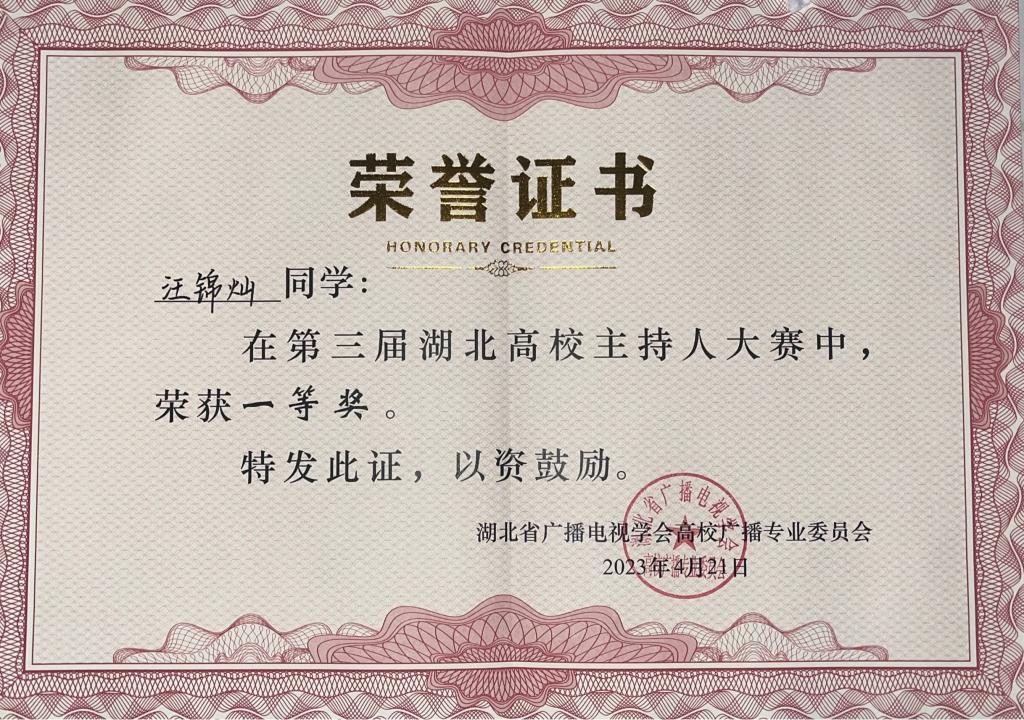 据悉,4月25号,第三届湖北高校主持人大赛在湖北经济学院展开角逐,公司播音与主持艺术专业汪锦灿同学表现优异,斩获一等奖。