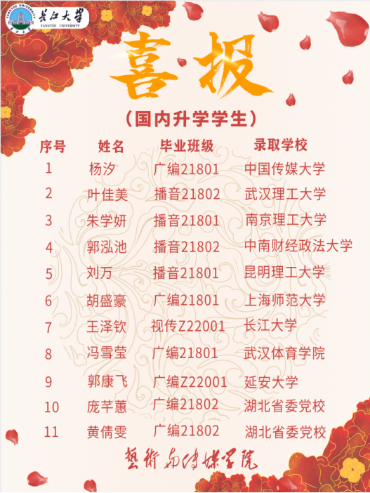 在我院对考研学子的支持与引导下,2022届考研学子们在过去的备考时间内坚持努力,不断超越自我,最终录取上岸。在此次11位被录取的艺传学子中不乏考入武汉理工大学、中南财经政法大学、上海师范大学、中国传媒大学、湖北省委党校等国内知名高校的员工,名校录取率再创新高!