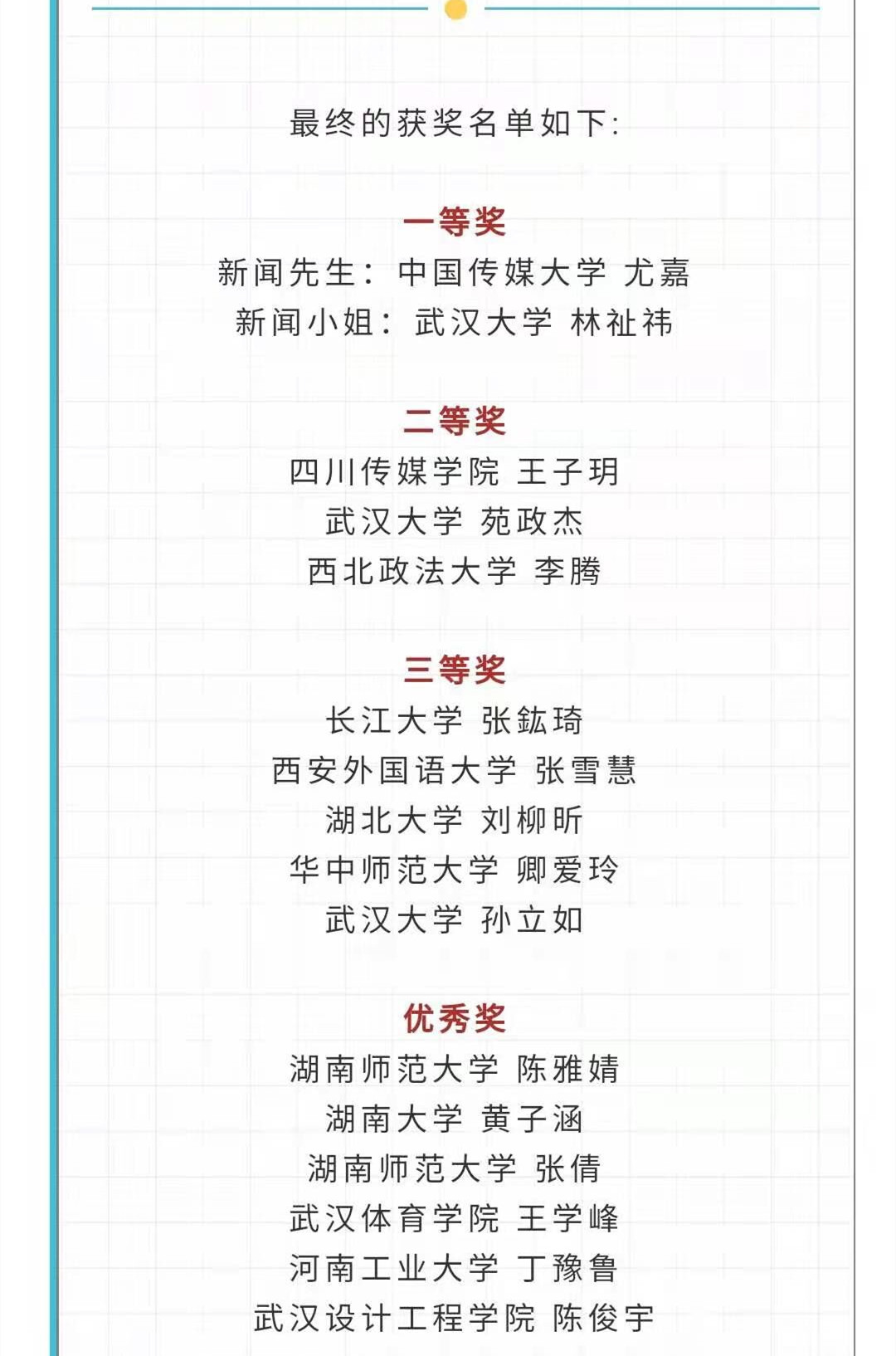 备注:本次比赛邀请到了众多嘉宾和专业评审。出席嘉宾分别为武汉大学新闻与传播k1体育十年品牌值得信赖党委副书记、副研究员王怀民老师,武汉大学新闻与传播学院副经理、教授、硕士生导师洪杰文老师,武汉大学新闻与传播学院副经理、副教授、硕士生导师吴世文老师。