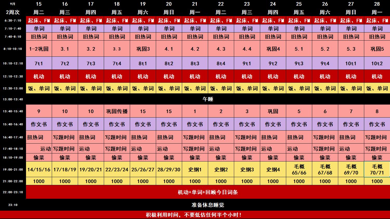 纵观考研的这一年多时间,她不停焦虑,又不停解剖自己。面对焦虑,每一个考研人都无法避免,作为一个过来人,她的经验就很简单:好好学习,天天向上。看起来简单,但落到实处,能否做到每日冷静的,摒弃一切信息焦虑,做好自己手中的事,每天都进步一点点,如何做到,如何做好,是值得每一个考研人用一段时间来仔细思考的。关于如何做到,下面这份计划表可以分享给大家,关于如何做好,就需要各位后生自己探索了。