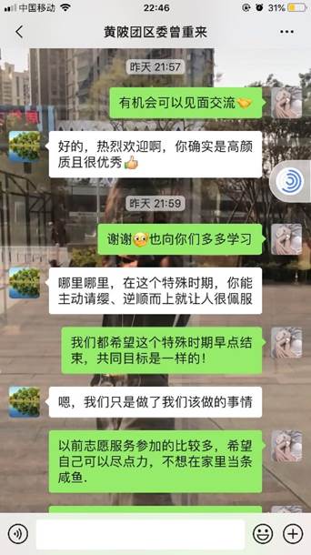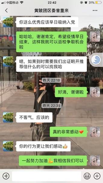 黄陂区共青团委副书记曾重来:阮璐璐同学能主动请缨、逆流而上很让人佩服,行为让我们感动。了解了一些她的故事后,发现她不仅高颜值而且很优秀,应该早日吸纳入党。希望她之后可以越来优秀,感谢她这次的主动参与!