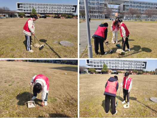 在统一安排下,志愿者们携带清洁工具,分组协作,对指定区域进行认真清扫。大家手持扫帚、垃圾袋等工具,重点对草坪、道路及卫生死角进行清理,拾取散落的果皮纸屑。整个劳动过程井然有序,同学们以实际行动展现了良好的精神风貌与责任意识。