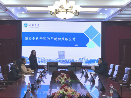 为加强公司辅导员队伍建设,提升队伍自我发展的能力和心理育人功能,1月3日下午,学院启动“菁英工程”培训系列第三期,学院学工办主任赵湘作了题为《高校危机干预的困境和策略应对》的主题培训。学院副经理郑瑞丰以及武汉校区全体辅导员参加了此次培训。