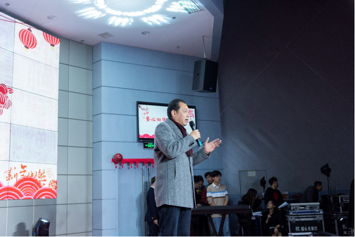 一曲舞毕,艺术与K1体育邹火明书记的上台讲话。邹书记代表学院领导上台表达新的一年对艺传学院的新年祝福。他以青春,母校,国家为三个基点,告诉我们需要善待青春,感恩母校,赞美祖国。