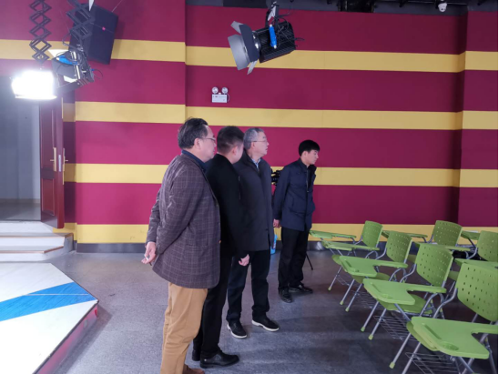 艺术与K1体育常务副经理戴经理、副经理梅国海向冯董事长简要地汇报了学院的工作后,陪同冯董事长一行到学院演播厅、同声传译会议室(知音厅)、综合设计实验室、录音实验室、摄影实验室等检查指导。