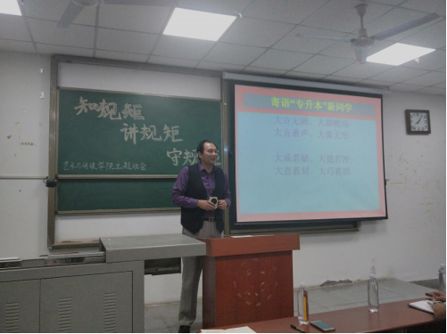 最后,邹火明书记以寄语“专升本”新同学为题,引用老子《道德经》的部分内容,从“坐什么车?”、“到什么站?”、“成什么人?”三个方面展开,以朱熹在他所著《大学》中提出的"明明德"、"亲民"、"止于至善"三者,"格物"、"致知"、"诚意"、"正心"、"修身"、"齐家"、"治国"、"平天下"八项,着眼于同学们个人道德和社会道德的完善,希望同学们能够对自己严要求,心中怀揣梦想,努力让梦想照进现实。