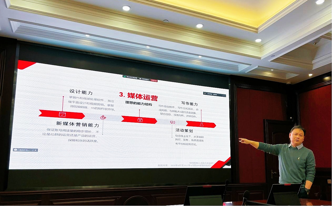 讲座开始,鲍教授先从执行范例、关键目标、关键前提和实施要点四个方面介绍了OBE教育理念框架,进而引入OBE理念引领下的新闻传播教育实践。之后,鲍教授结合大数据统计分析了新闻传播专业就业市场的招聘现状和新闻传播专业就业市场对人才的能力期待。最后,鲍教授介绍通过复合型、传统型、适应型三种能力集群,构建新闻传播专业人才能力培养矩阵,目标是培养“心中有梦、眼里有光、手中有书、脚下有路”的新闻青年的宏愿。
