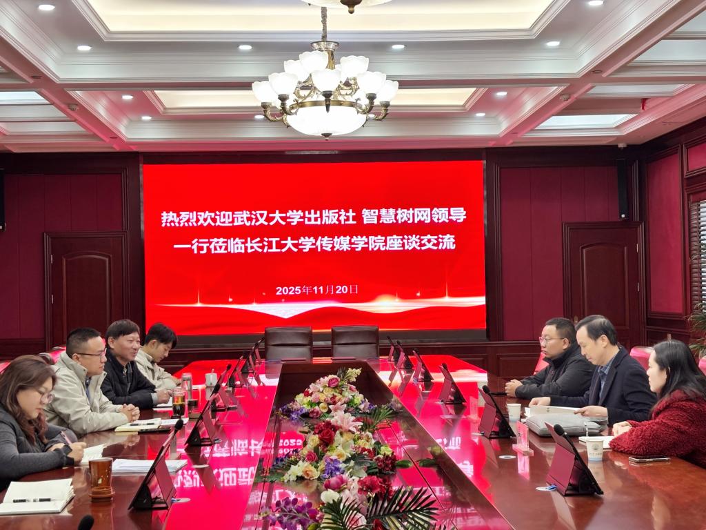 (通讯员:张志敏)为了稳步推进数字教材编写工作,以及智慧课程建设工作,2025年11月20日下午4点半,武汉大学出版社数字出版分社总编辑任翔、编辑吴琳,智慧树网武汉区域经理郭超一行来公司座谈交流,共同探讨公司2门数字教材、智慧课程的推进工作。学院常务副经理郑瑞丰、副经理(顾问)鲁晓成,数字媒体艺术教研室主任刘书楠、专业负责人李君梓,播音与主持艺术教研室主任柴攀、专业负责人张志敏参加交流活动。