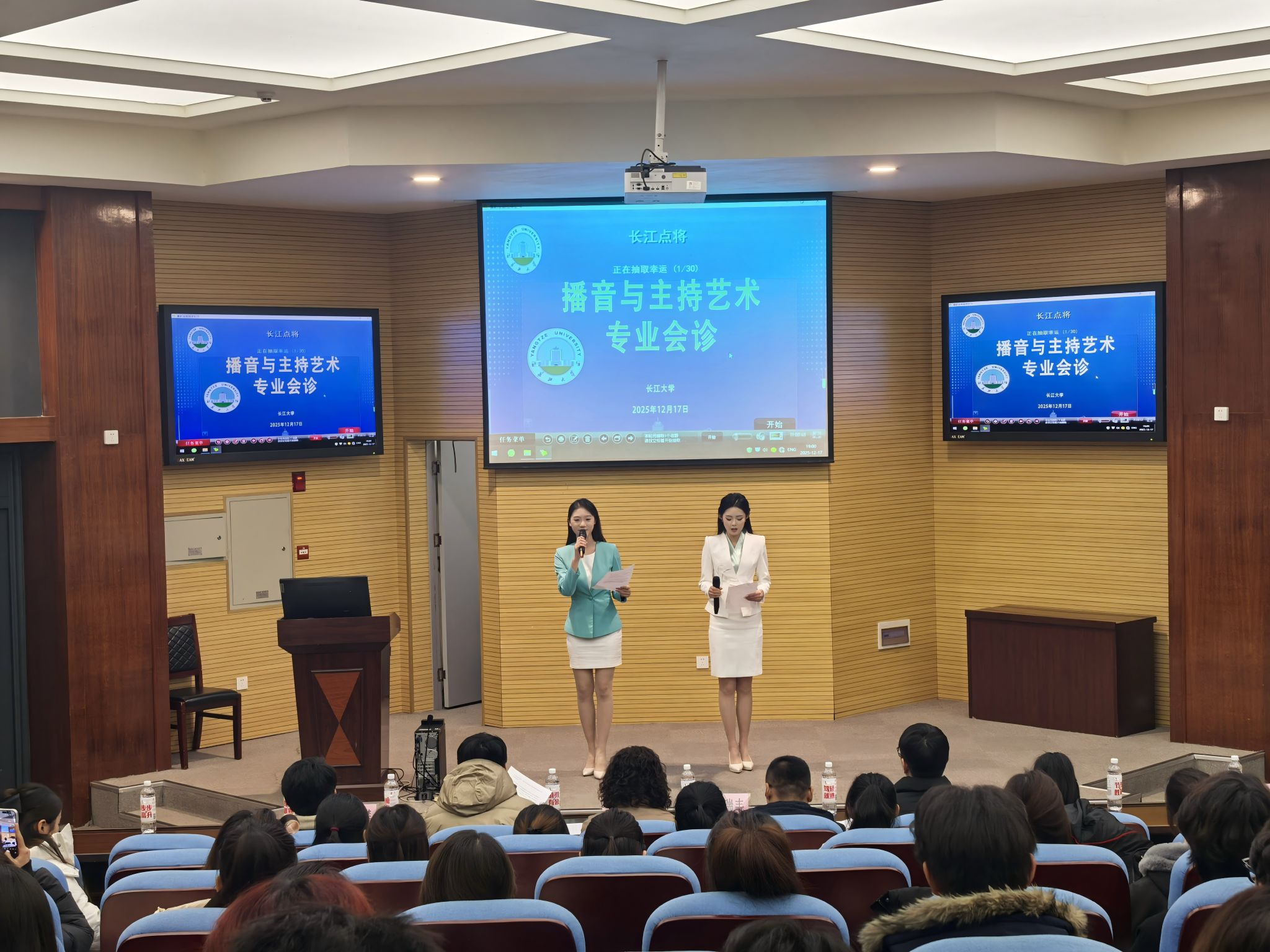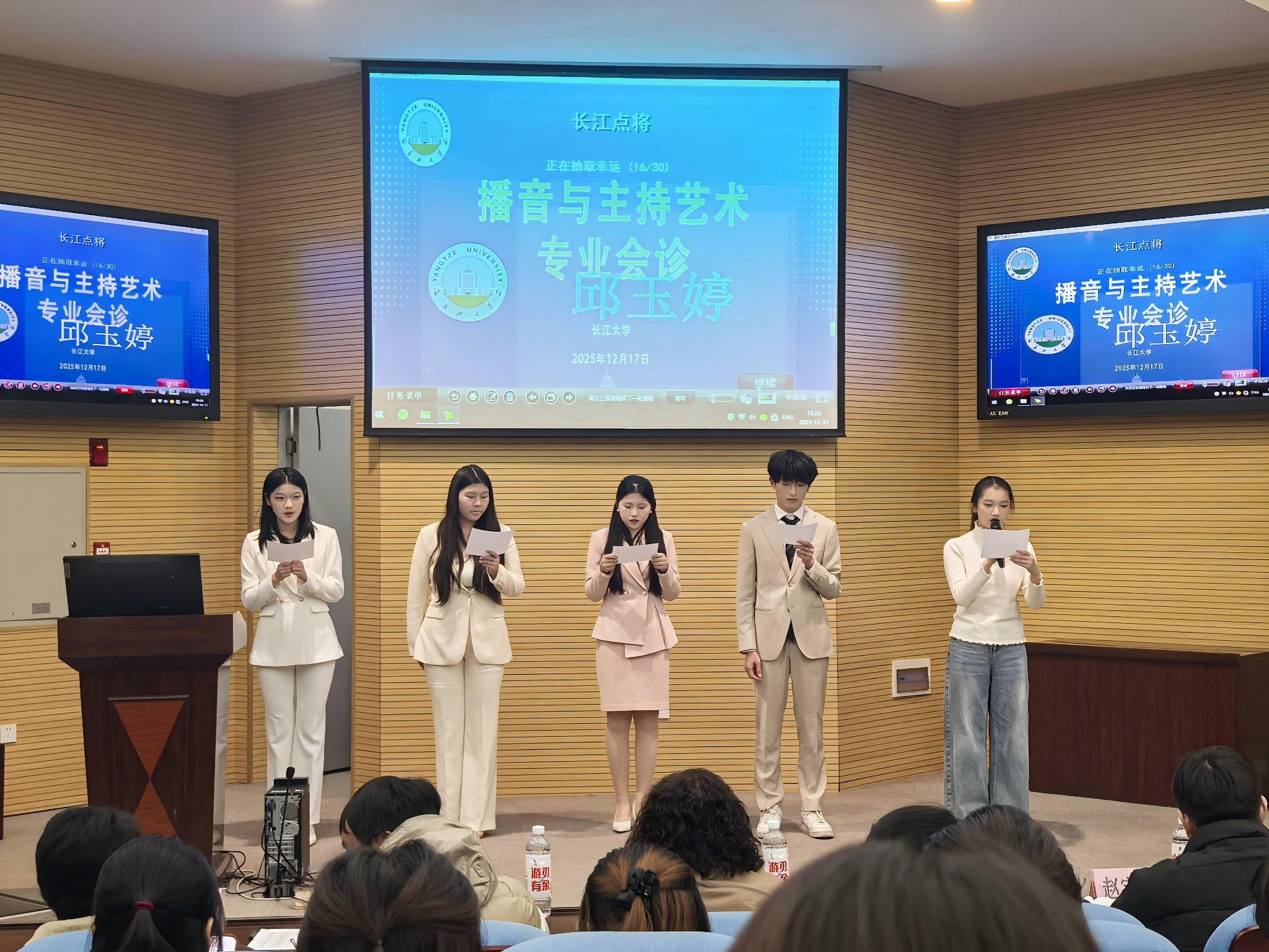 (通讯员:窦语晨)2025年12月17日晚,K1体育在荆州西校区举办了“长江点将”播音与主持艺术专业会诊活动。K1体育常务副经理郑瑞丰、副经理李琴出席,湖北广播电视台新闻中心记者万力源、k1体育官方网站外国语学院省级普通话测试员赵宇杰、K1体育播音与主持艺术专业教研室主任柴攀组成专业评审团,在播音与主持艺术专业韩雅茜老师的组织下,共同为2025级播音与主持艺术专业员工会诊指导。