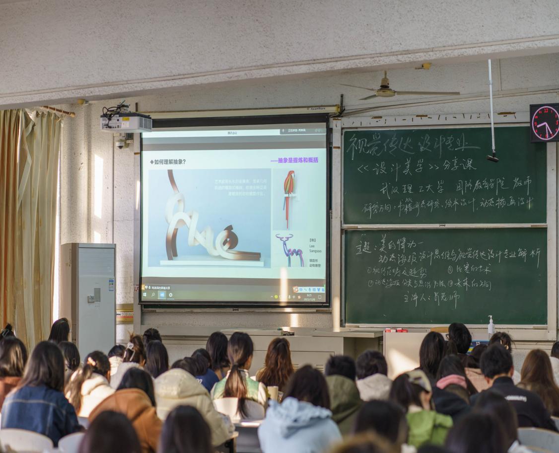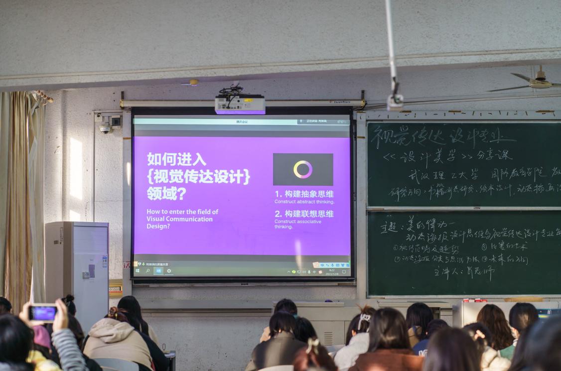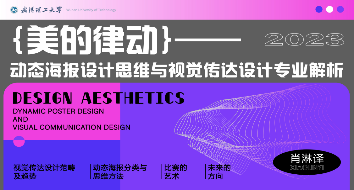 本次课程邀请了武汉理工大学国际教育学院肖淋译老师为主讲人,主题为“美的律动:动态海报设计思维与视觉传达设计专业解析”。本次讲座共分为四个部分:一是视觉传达设计范畴及趋势;二是动态海报分类与思维方法;三是比赛的艺术;四是未来的方向。