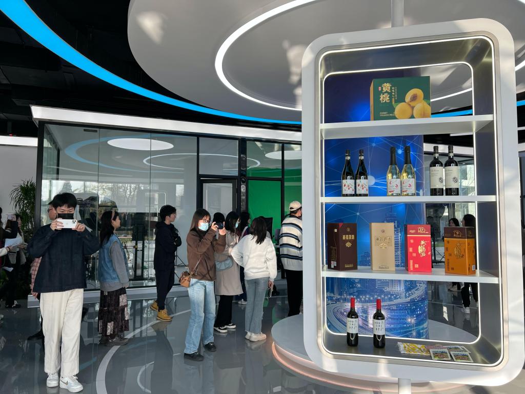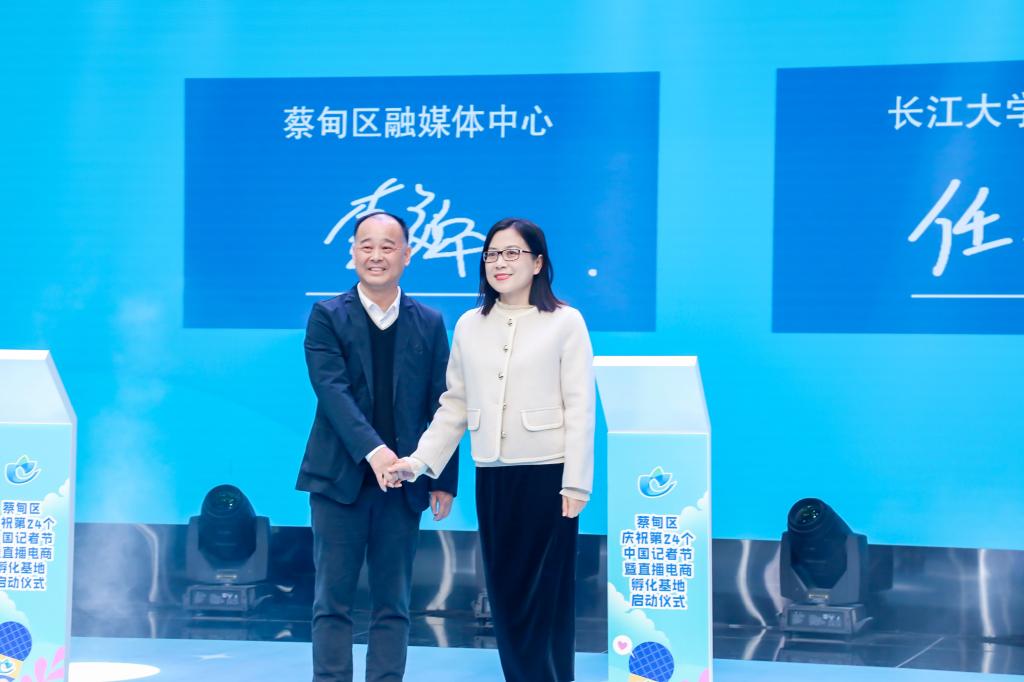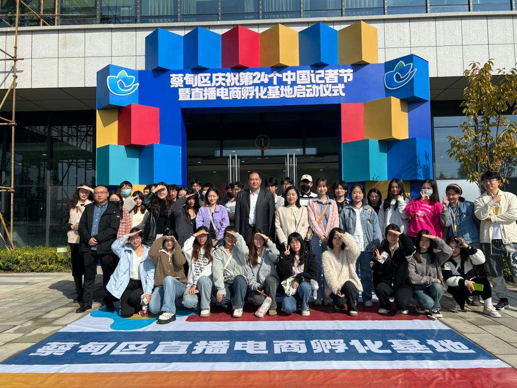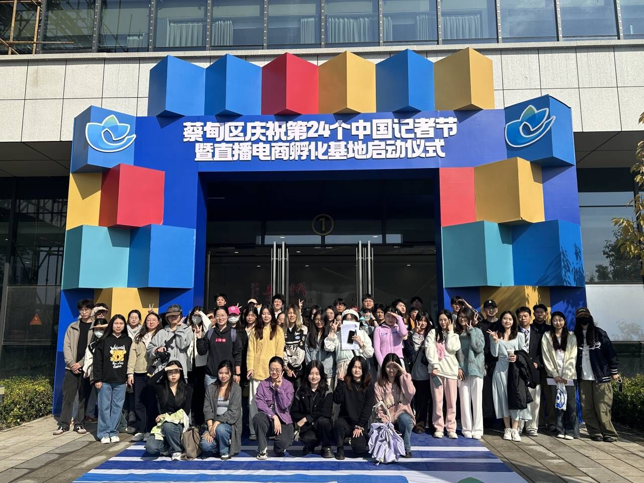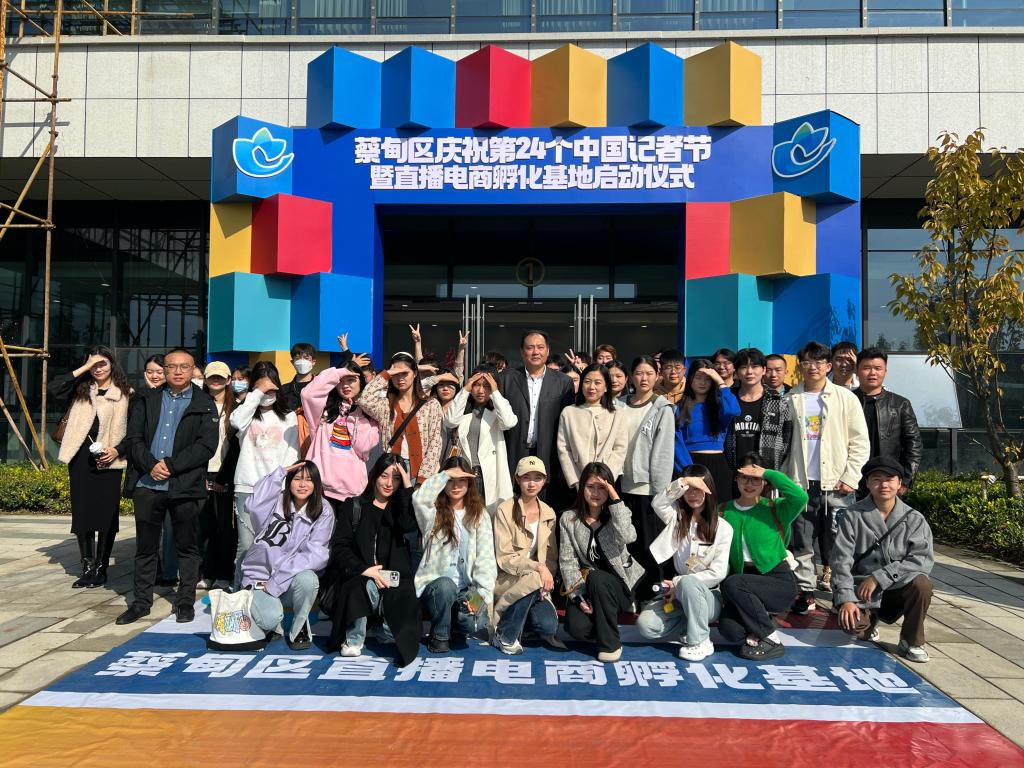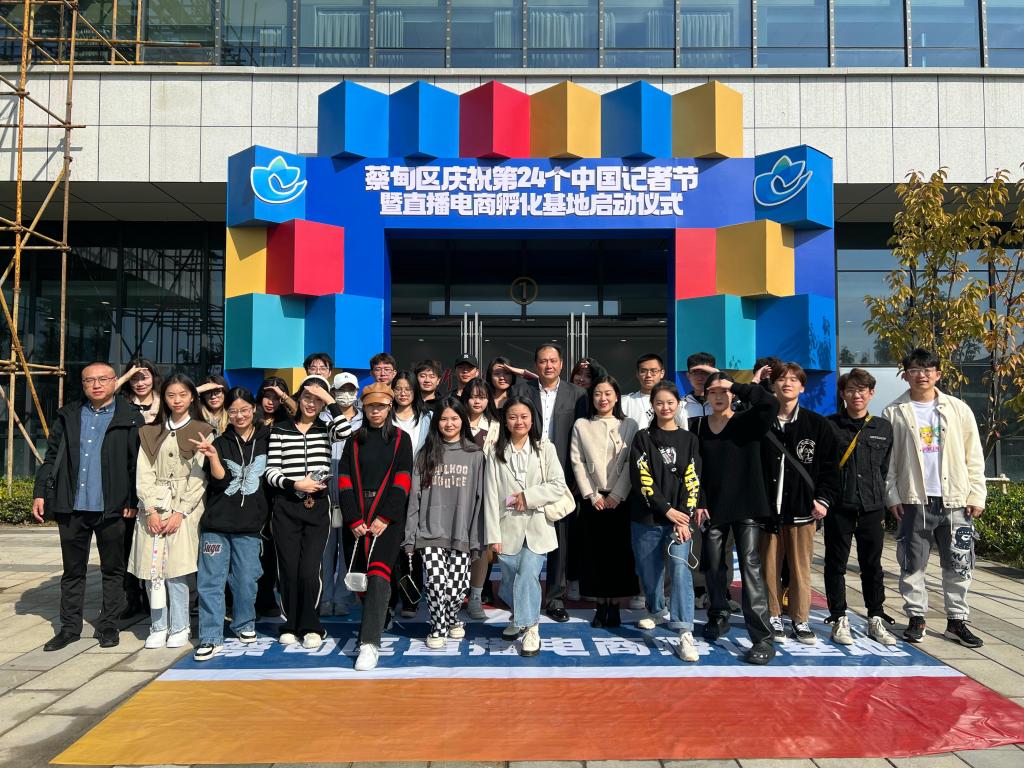 在蔡甸区融媒体中心工作人员的带领下,师生共同参观中心宣传区和直播电商孵化基地,并观看记者节特别活动和项目启动仪式,对记者这一神圣的职业领域进行更为深入的了解,感受并体验互联网环境下“直播+电商”的运营模式。