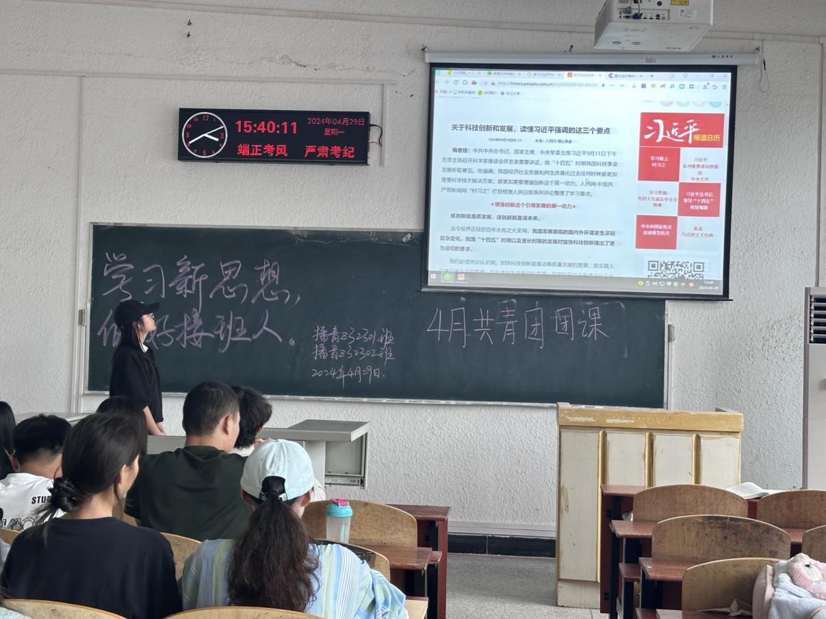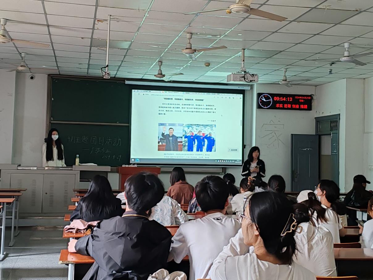 活动伊始,各班团支书带领同学们学习了习近平总书记关于航天事业发展的系列重要论述和重要指示批示精神,深刻领悟习近平总书记关于航天事业的重要论述,引导同学们坚定勇于战胜一切艰难险阻、敢于攀登科技高峰的信心决心。同时,同学们一起学习习近平总书记关于科技创新的重要论述和指示批示精神,各班团支书也鼓励同学们积极参与2024年“挑战杯”“创青春”系列赛事,大力推进科技创新成果转化。