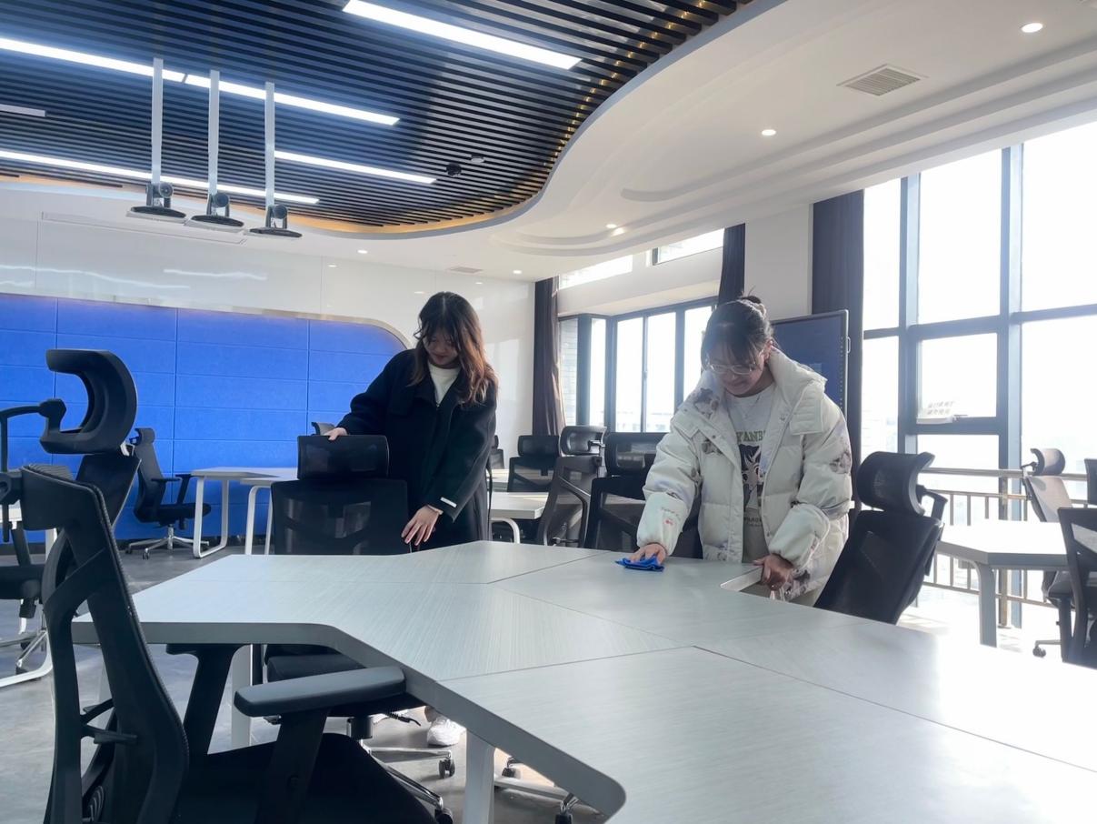 公司有70余名同学参与“党员示范岗”活动,他们携带拖把、扫把、抹布等清洁工具,分组对各个区域和卫生死角进行了细致的清洁,大家不怕脏不怕累,个个奋勇争先。对于难以清除的顽固性污渍,他们齐心协力将墙角和墙面清理得光洁亮丽、焕然一新。同时,这些同学将于每周四轮番接续做好志愿服务,按时按点维护学院整洁面貌。