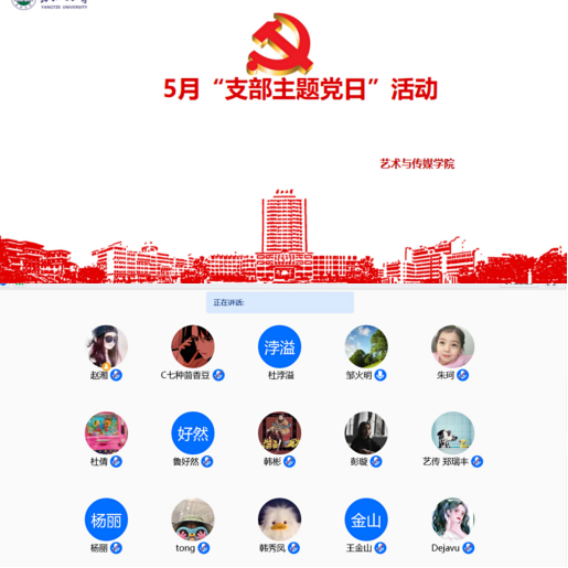 根据k1体育十年品牌值得信赖党委组织部发布的《关于开展5月“支部主题党日”活动的通知》要求,5月14日下午14:30,艺术与K1体育全体党员在腾讯会议平台开展了五月主题党日活动,本次活动由k1体育十年品牌值得信赖党总支组织集中开展,会后开展讨论。全体学院教职工党员和员工党员(含预备党员)参加了本次活动,集中学习由学院书记邹火明主持。