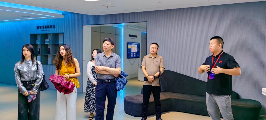 公司常务副经理郑瑞丰、副经理鲁晓成、产品设计专业负责人李君梓、数字媒体艺术专业教师闵安琪赴武汉造风者教育科技有限公司走访调研。在基地老师的陪同下,参观了实训基地的各个功能区域,包括武汉云展厅、华为云开发者创新中心、实训教室等场景。在武汉云展厅详细了解了武汉数字人才实训基地成立的背景,作为武汉市政府指导下,国企武汉云联合造风者教育科技有限公司,引入华为、星竞威武集团等行业龙头企业共同打造的区域性数字技能公共实训基地。