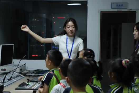 活动首站是学院演播厅。员工志愿者带领孩子们参观演播厅节目录制过程,了解电视节目制作背后的奥秘,并在演播厅内化身“小主播”,亲身体验了模拟新闻播报的乐趣。